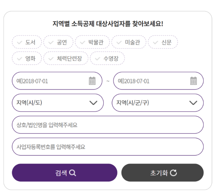 문화비 소득공제를 이용하려면 일단 본인이 이용하는 문화공간의 사업자가 문화비 소득공제 사업자로 등록되어 있는지 확인을 해야 합니다. 상호나 법인명을 모르더라도 문화공간이랑 지역만 체크해서 검색해도 결과가 나오니 내 동네 근처에는 어떤 곳들이 있는지 확인해 보시는 것도 나쁘지 않을 것 같습니다.